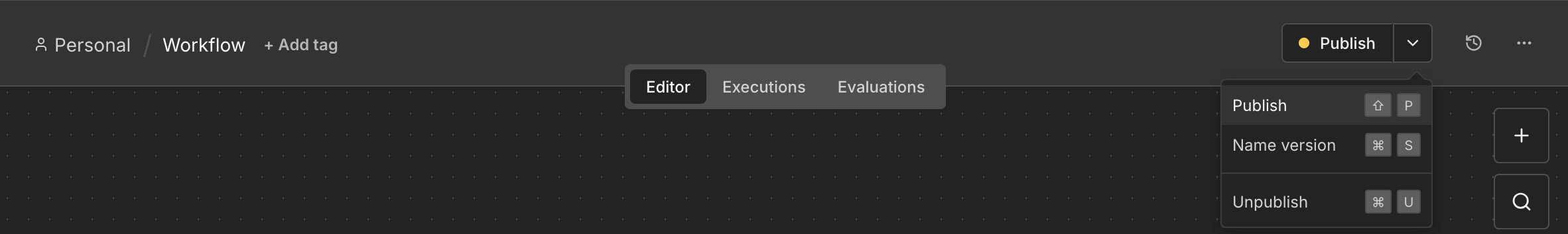 n8n auto saves your workflow while you're editing. When you're ready to put the workflow into production, publish your workflow. This approach prevents accidental production changes while enabling safe iteration and review.